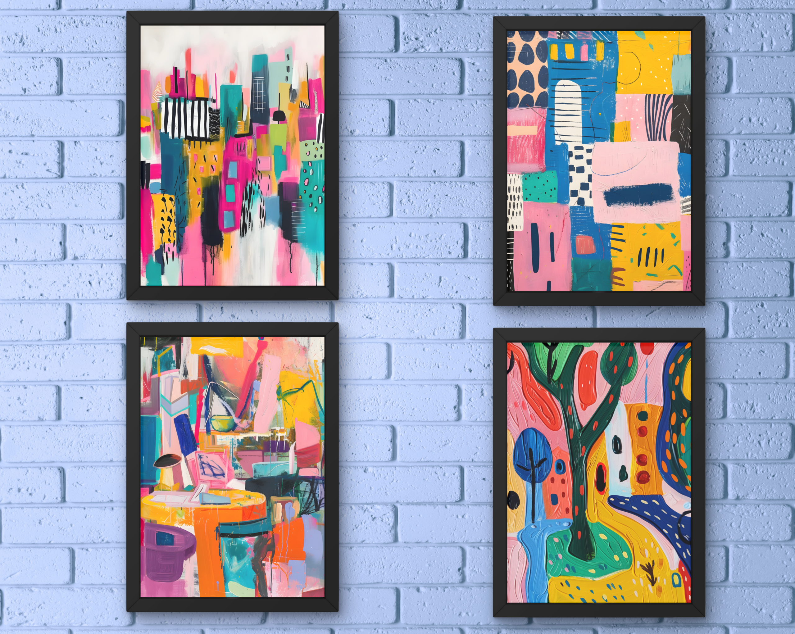 Add a bold and vibrant touch to your interiors with this Modern Abstract Color Splash Wall Art Frame Set. This 4-piece collection features eye-catching contemporary designs filled with expressive brush strokes, geometric patterns, playful textures, and dynamic color combinations. Each artwork blends shades of pink, teal, yellow, blue, and black to create a lively and energetic visual statement.