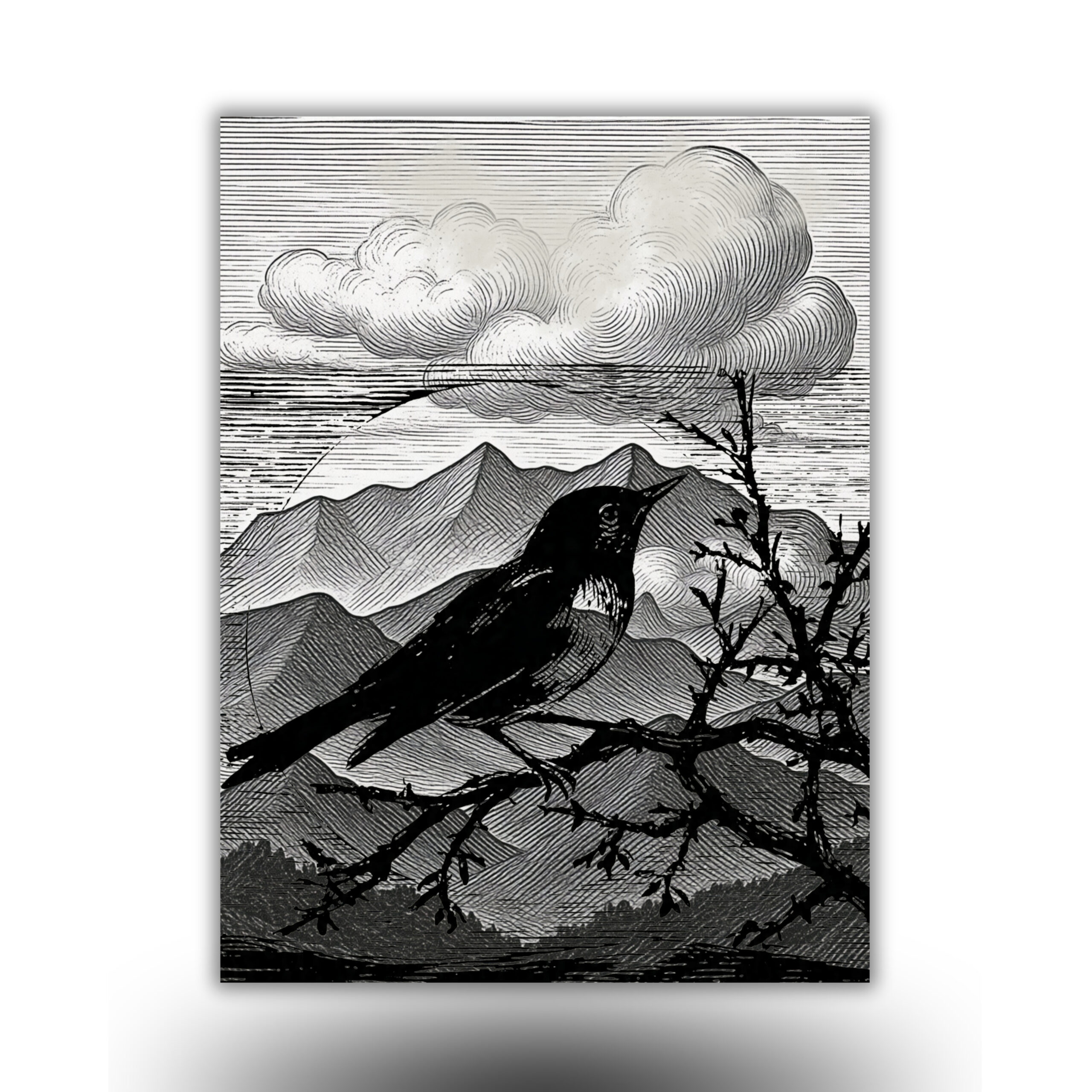 Bring a bold and artistic atmosphere to your home with this Modern Crow Sunset Printable Wall Art. This stunning digital artwork features a dramatic crow perched on a branch with beautiful mountain landscapes and vibrant sunset tones. The design combines minimalist, vintage engraving, and modern abstract styles, making it a perfect statement piece for contemporary interiors.