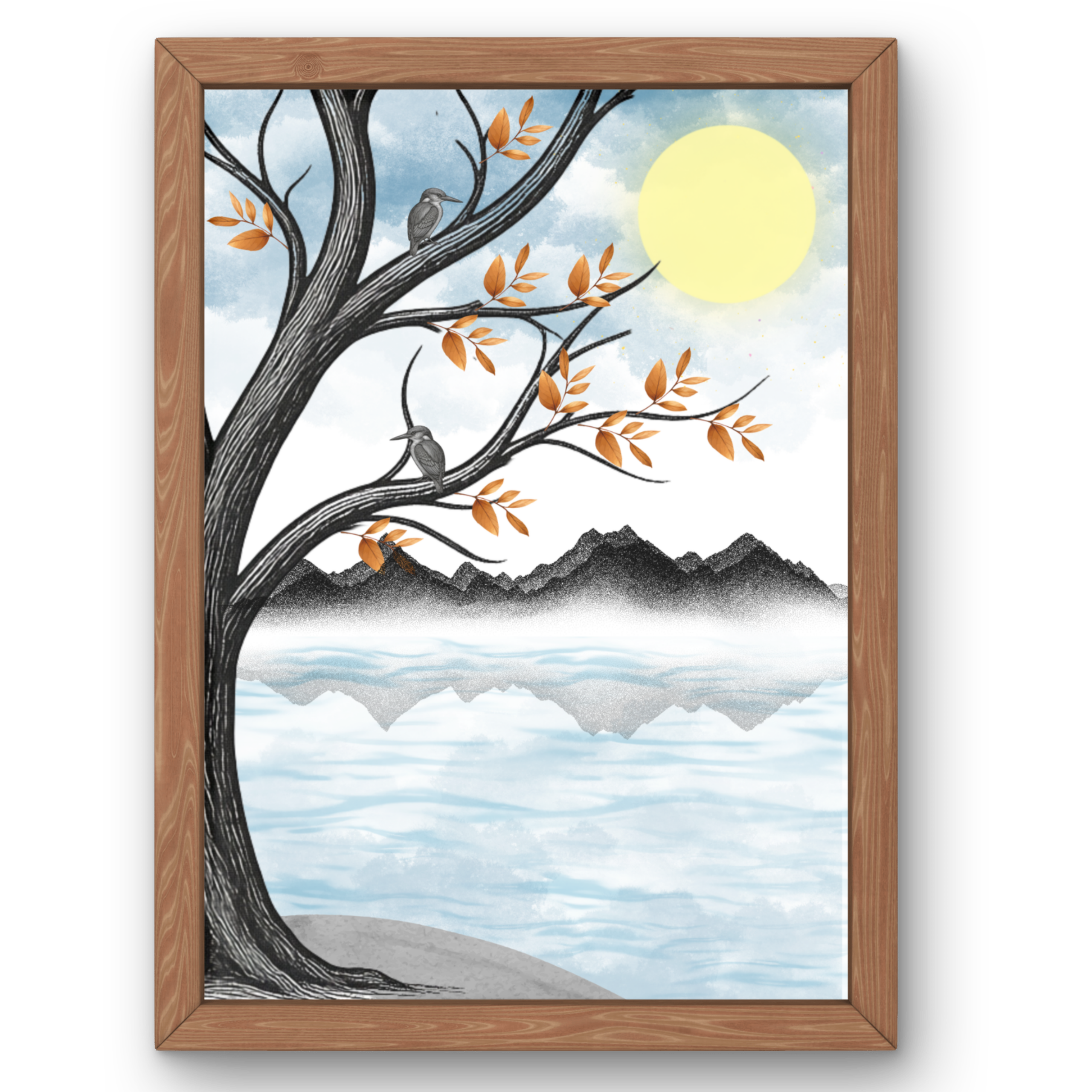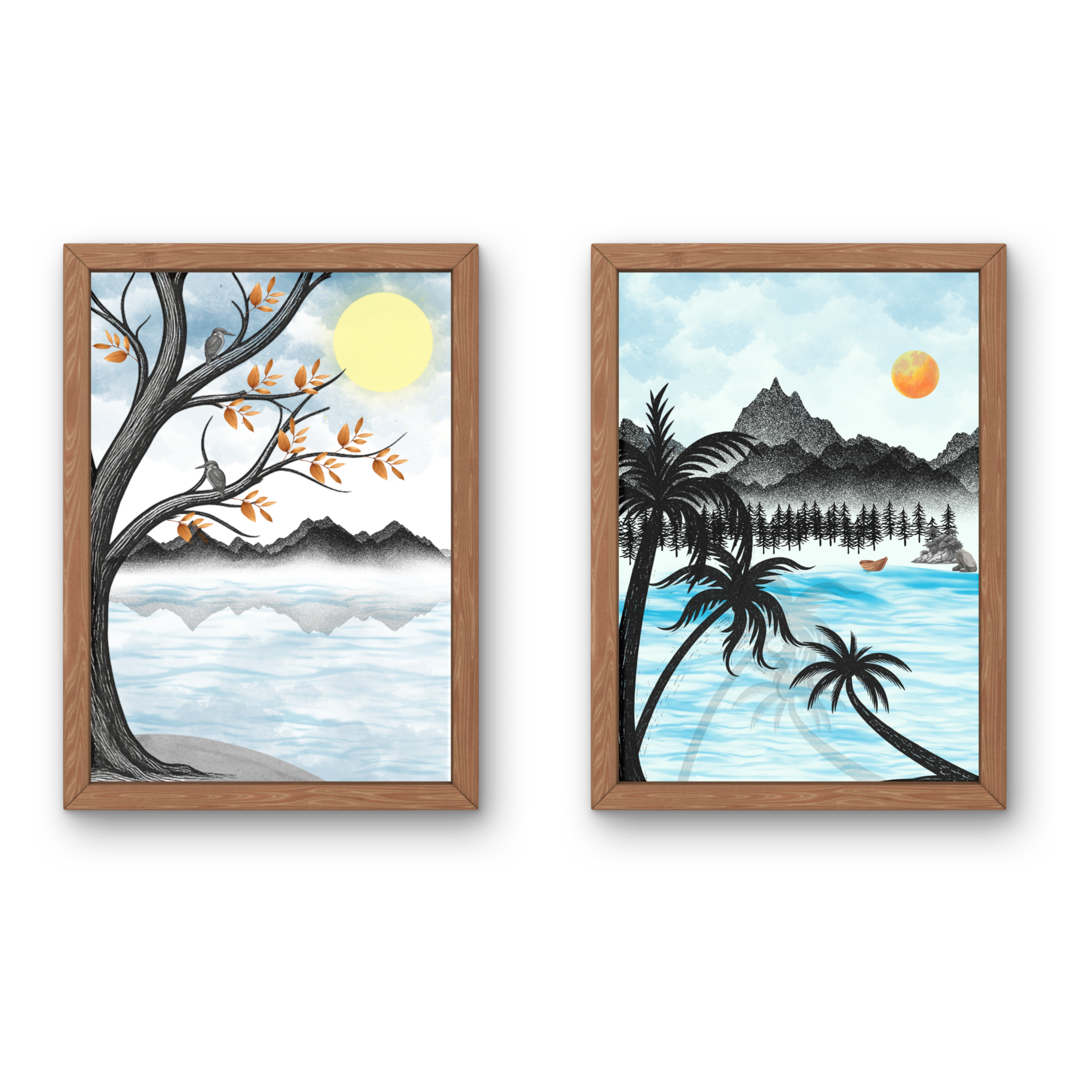 Bring calm, peaceful nature vibes into your home with this beautiful set of two printable landscape wall art designs. This artwork combines minimalist mountain scenery, tranquil water reflections, palm trees, birds, and warm sun tones to create a relaxing atmosphere in any space. The soft blue water, subtle mountains, and elegant black illustrations give the artwork a modern yet natural aesthetic perfect for contemporary interiors.