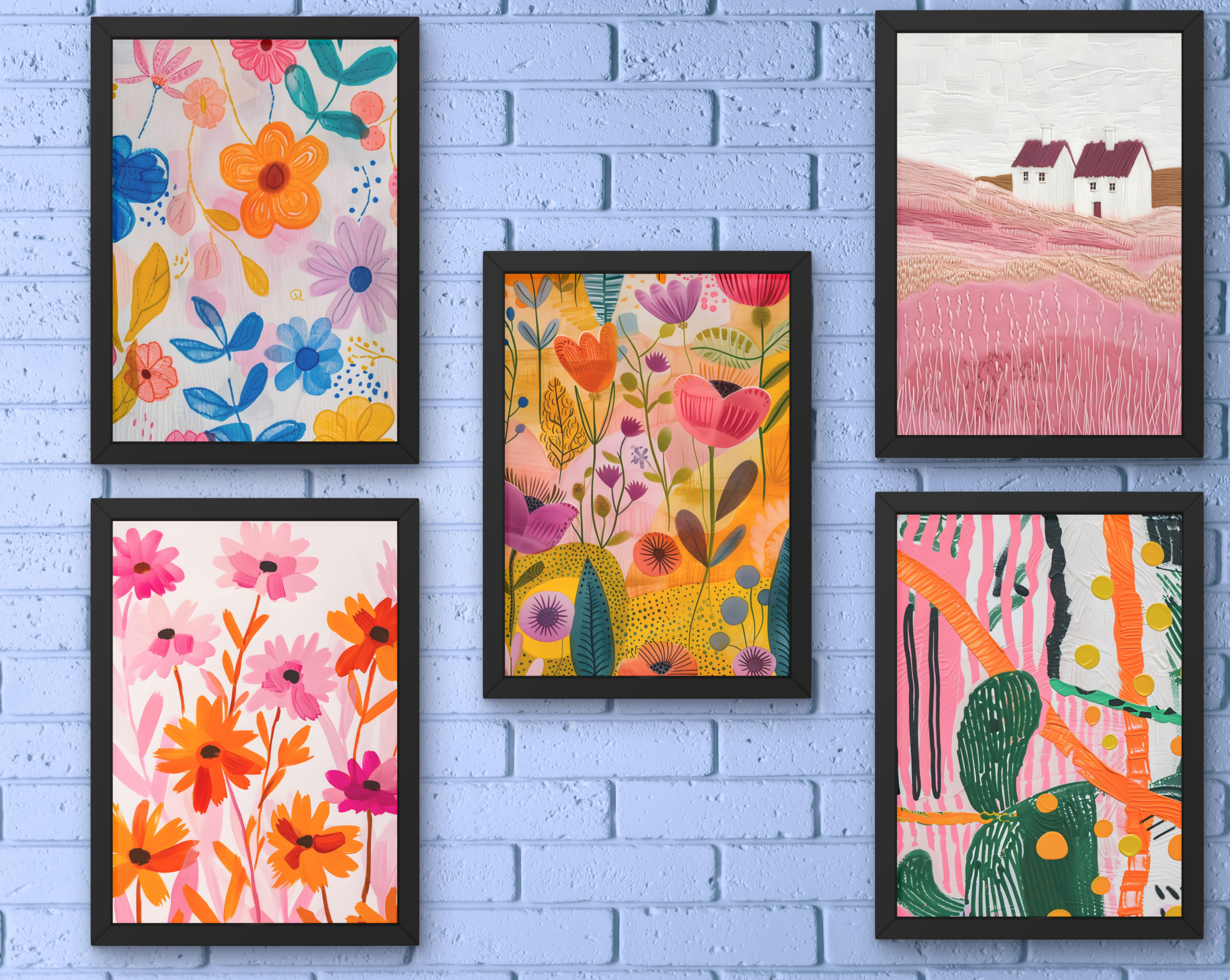 Refresh your space with this beautifully curated Vibrant Floral & Pastel Landscape Wall Art Frame Set. This 5-piece collection blends colorful botanical illustrations, blooming garden artwork, soft countryside scenery, and modern abstract floral patterns to create a lively yet soothing wall display.